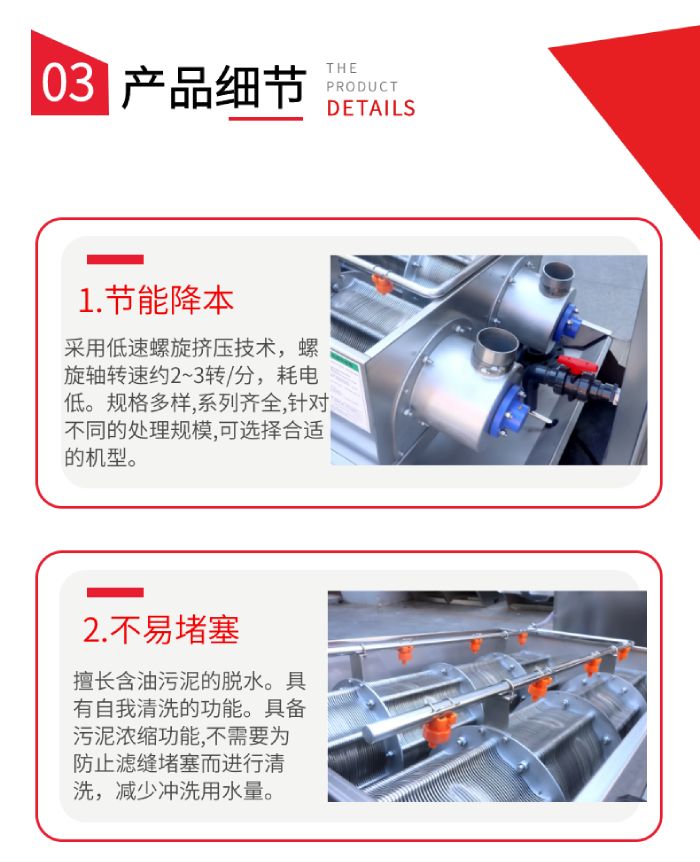 疊螺式污泥脫水機(jī)是一種專門用于污泥脫水的設(shè)備,它采用雙螺桿式濃縮脫水機(jī)的原理,通過夾層螺旋推進(jìn)器,將污泥在篩管內(nèi)沿著螺旋軸線推進(jìn),使污泥進(jìn)入螺旋壓榨器,然后將螺旋壓榨器中的污泥沿著篩管內(nèi)的規(guī)定道路進(jìn)行濃縮和脫水,在不斷旋轉(zhuǎn)的壓榨器中,將污泥和水分離,從而實(shí)現(xiàn)快速的脫水。疊螺式污泥脫水機(jī)具有結(jié)構(gòu)簡(jiǎn)單、占地面積小、運(yùn)行成本低、脫水效率高、操作維護(hù)簡(jiǎn)便等優(yōu)點(diǎn)。同時(shí),疊螺式污泥脫水機(jī)的操作過程中沒有任何化學(xué)藥品的添加,也不存在二次污染的風(fēng)險(xiǎn),遵循了可持續(xù)發(fā)展的基本原則,能夠有效地解決污水處理過程中的問題。在污水處理廠中,疊螺式污泥脫水機(jī)是非常重要的一個(gè)環(huán)節(jié),它能夠?qū)⑽勰嘀械乃挚焖俚孛摮鰜?,讓污泥變得更加稠厚,減少其體積,降低固體污泥的含水率,從而更方便進(jìn)行處理和運(yùn)輸,減少對(duì)環(huán)境造成的污染。
