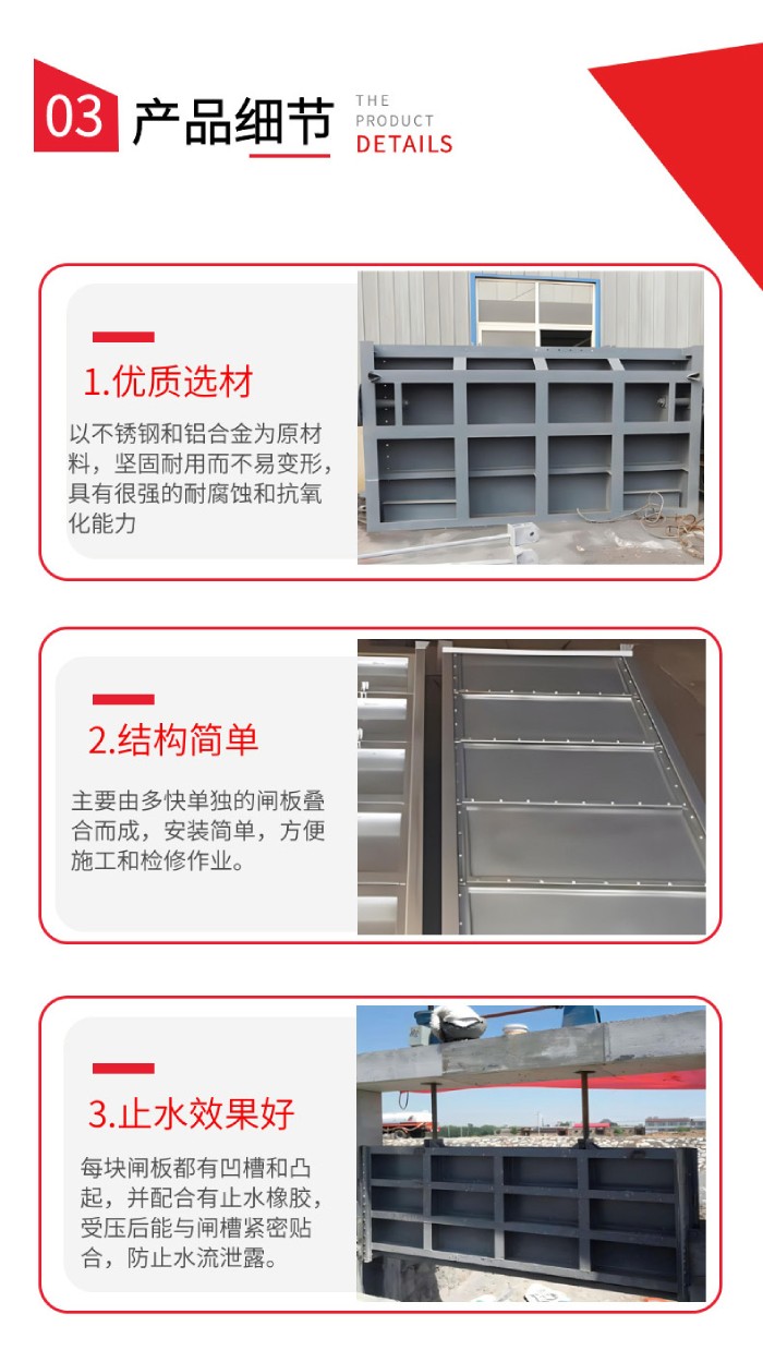 疊梁閘門是一種專門的閘門,它由多塊單獨(dú)的閘板放入門槽內(nèi)制成的一個(gè)平面檔水結(jié)構(gòu),它從外表看有點(diǎn)像平時(shí)看到的門。疊梁閘門中的閘片在放入門槽的時(shí)候有一定的順序,全部放完以后會(huì)構(gòu)成一個(gè)平面,這種閘門的閘板與閘板之間有一定的自重,它工作時(shí)也是靠這種自重起到應(yīng)有的密封作用。但疊梁閘門的水位密封性不是非常好,會(huì)有很大出現(xiàn)滲漏的可能,因而不適合做為長(zhǎng)期的閘門來使用,平時(shí)人們多會(huì)把它用做臨時(shí)檔水設(shè)施或者在檢修閘門的時(shí)候使用。被廣泛用用于車庫,水壩水廠,電廠以及污水處理廠等行業(yè)中,能夠起到比較好的截流作用。