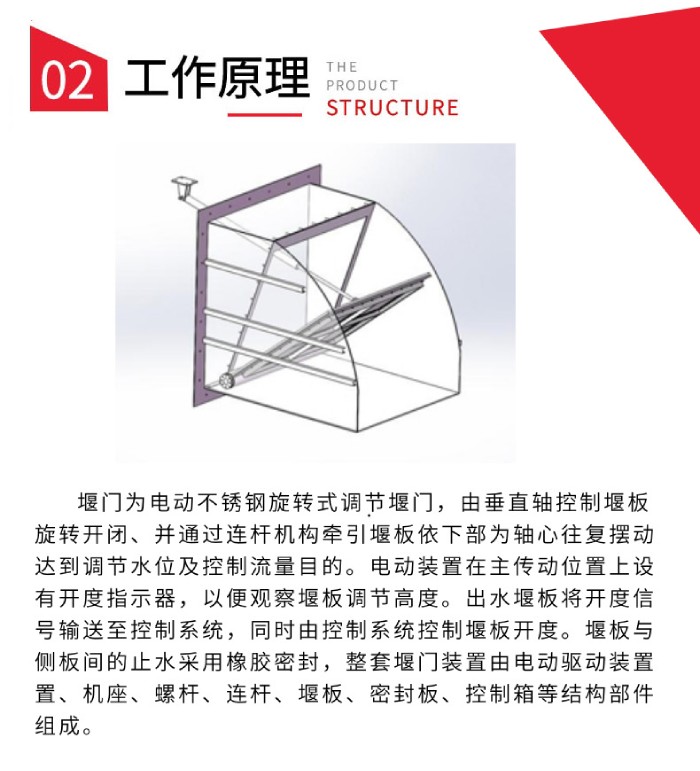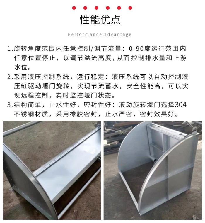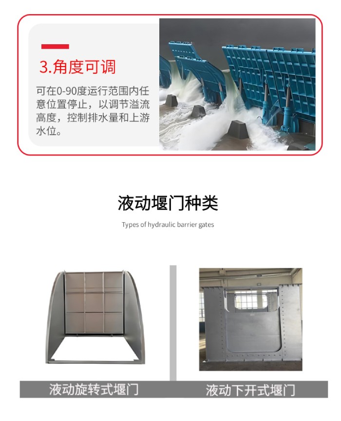 液動旋轉堰門是一種結構緊湊、耐腐蝕、密封性能好的流體排放控制設備,堰門結構類似閘門,但其向上為關,向下為開。堰門采用明桿升降式、橡膠密封止水結構形式,啟閉機與門體采用螺桿及連接軸聯(lián)接。根據(jù)液位計提供的堰門前后水位,控制系統(tǒng)通過液壓缸實現(xiàn)堰門的開啟和關閉。通過液位計和角度傳感器,控制堰門的攔蓄高度,可實現(xiàn)截流蓄水、控制排水流量和調節(jié)上游水位等功能。它具有易于安裝、操作和維護的特點,能夠實現(xiàn)精確的液位控制和流量調節(jié)。