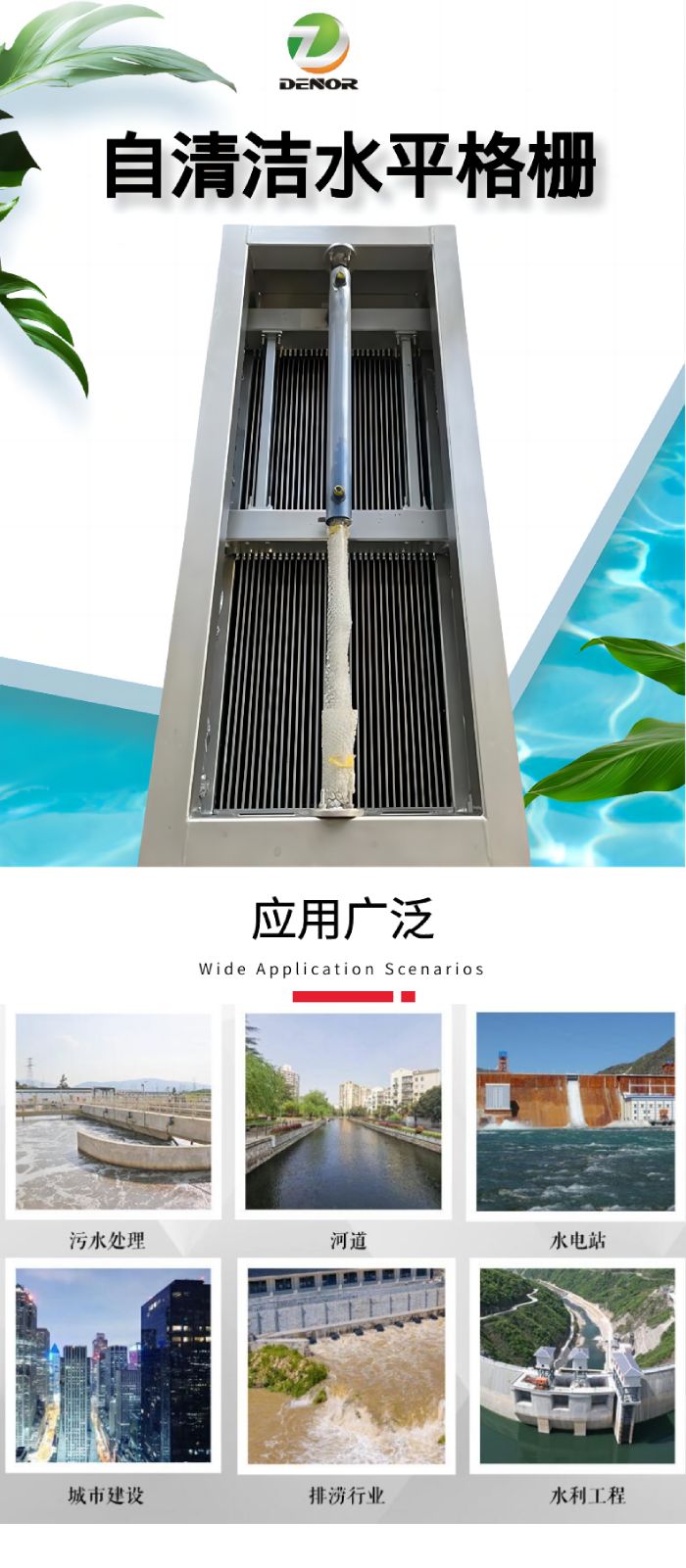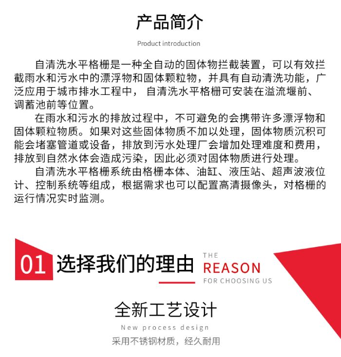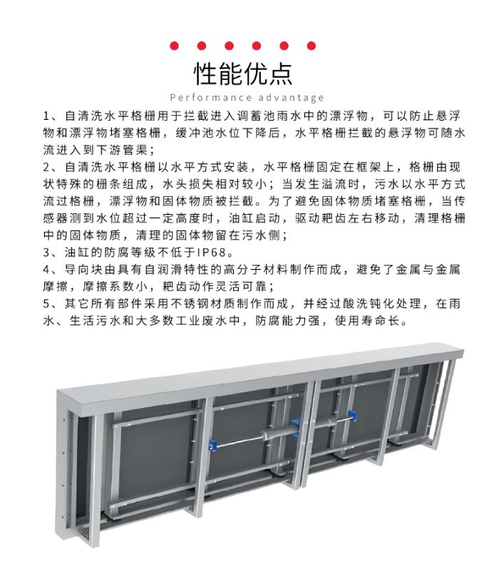 自清洗水平格柵是一種全自動的固體物攔截裝置,可以有效攔截雨水和污水中的漂浮物和固體顆粒物,并具有自動清洗功能,廣泛應(yīng)用于城市排水工程中, 自清洗水平格柵可安裝在溢流堰前、調(diào)蓄池前等位置。在雨水和污水的排放過程中,不可避免的會攜帶許多漂浮物和固體顆粒物質(zhì)。如果對這些固體物質(zhì)不加以處理,固體物質(zhì)沉積可能會堵塞管道或設(shè)備,排放到污水處理廠會增加處理難度和費用,排放到自然水體會造成污染,因此必須對固體物質(zhì)進(jìn)行處理。自清洗水平格柵系統(tǒng)由格柵本體、油缸、液壓站、超聲波液位計、控制系統(tǒng)等組成,根據(jù)需求也可以配置高清攝像頭,對格柵的運行情況實時監(jiān)測。